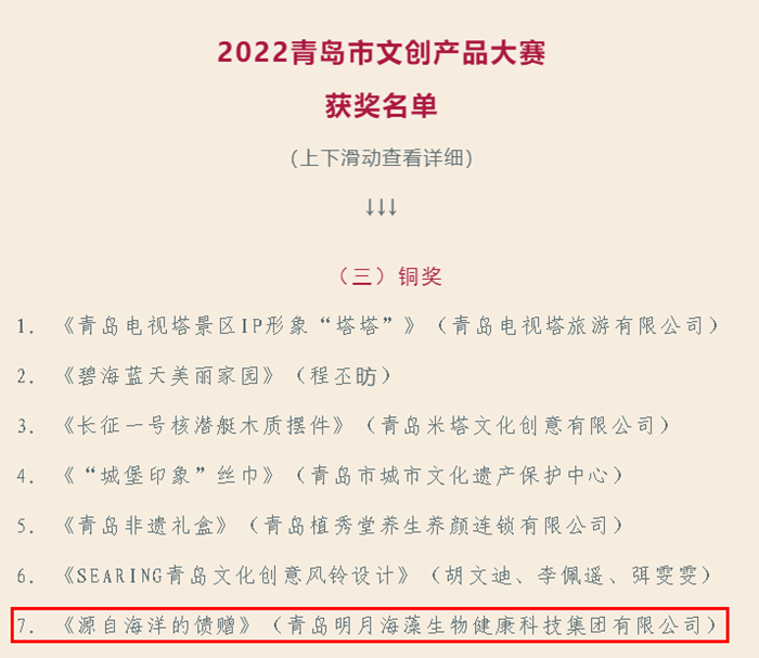 2022年,為保護、傳承、利用好傳統文化,推動優秀傳統文化創造性轉化、創新性發展,落實《“山東手造”推進工程實施方案》,青島市文化和旅游局、青島市廣播電視臺、青島開放大學共同啟動“山東手造 青島有禮”2022青島市文創產品大賽。經過網絡線上投票,11月26日,最終評選出“2022青島市特色伴手禮”十項,金獎10件、銀獎21件、銅獎32件及優秀獎94項。青島明月海藻生物健康科技集團有限公司文創產品《源自海洋的饋贈》榮獲設計類銅獎。