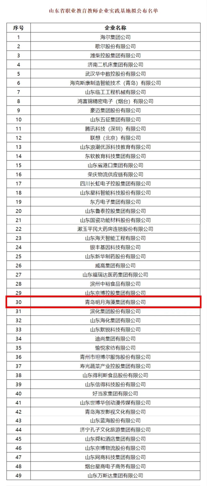 1月3日,山東省教育廳網(wǎng)站發(fā)布公示消息,經(jīng)各市、各高職院校推薦、專家評(píng)審,擬確定青島明月海藻集團(tuán)有限公司等49家企業(yè)為山東省職業(yè)教育教師企業(yè)實(shí)踐基地。公示期為2023年1月3日至1月10日。