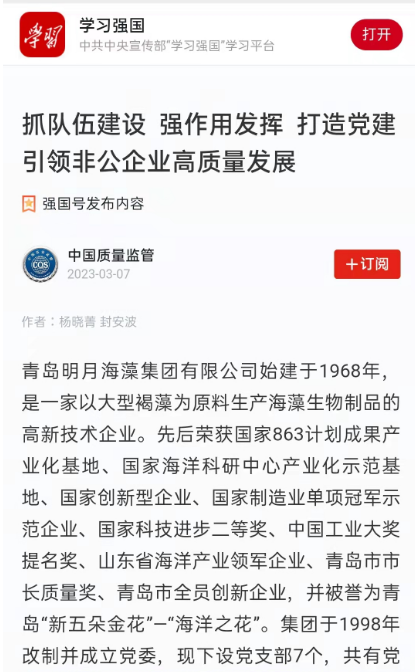 3月8日,中共中央宣傳部“學習強國”平臺發表題為《抓隊伍建設 強作用發揮 打造黨建引領非公企業高質量發展》的文章,報道青島明月海藻集團黨建工作經驗,產生了良好的社會反響。