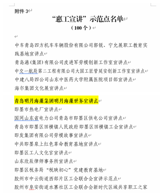 據了解,為深入貫徹落實習近平新時代中國特色社會主義思想,貫徹習近平總書記關于工人階級和工會工作的重要論述,加強和改進新時代職工思想政治引領工作,自2022年以來,青島市各級工會聚焦迎接、學習、宣傳黨的二十大,廣泛搭建提升職工思想道德文化素質的學習實踐平臺,不斷提高職工思想政治工作科學化規范化制度化水平,增強工作針對性實效性,現共從全青島市范圍內評選出10個職工思想政治教育實踐基地、100個“惠工宣講”示范點,我集團的“明月海藻世界”和“明月海藻世界宣講點”以絕對優勢分別榮獲這兩項殊榮。