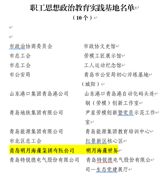 3月9日,從青島市總工會獲悉,青島明月海藻集團的“明月海藻世界”被評選為青島市職工思想政治教育實踐基地;“明月海藻世界宣講點”被評為青島市“惠工宣講”示范點。